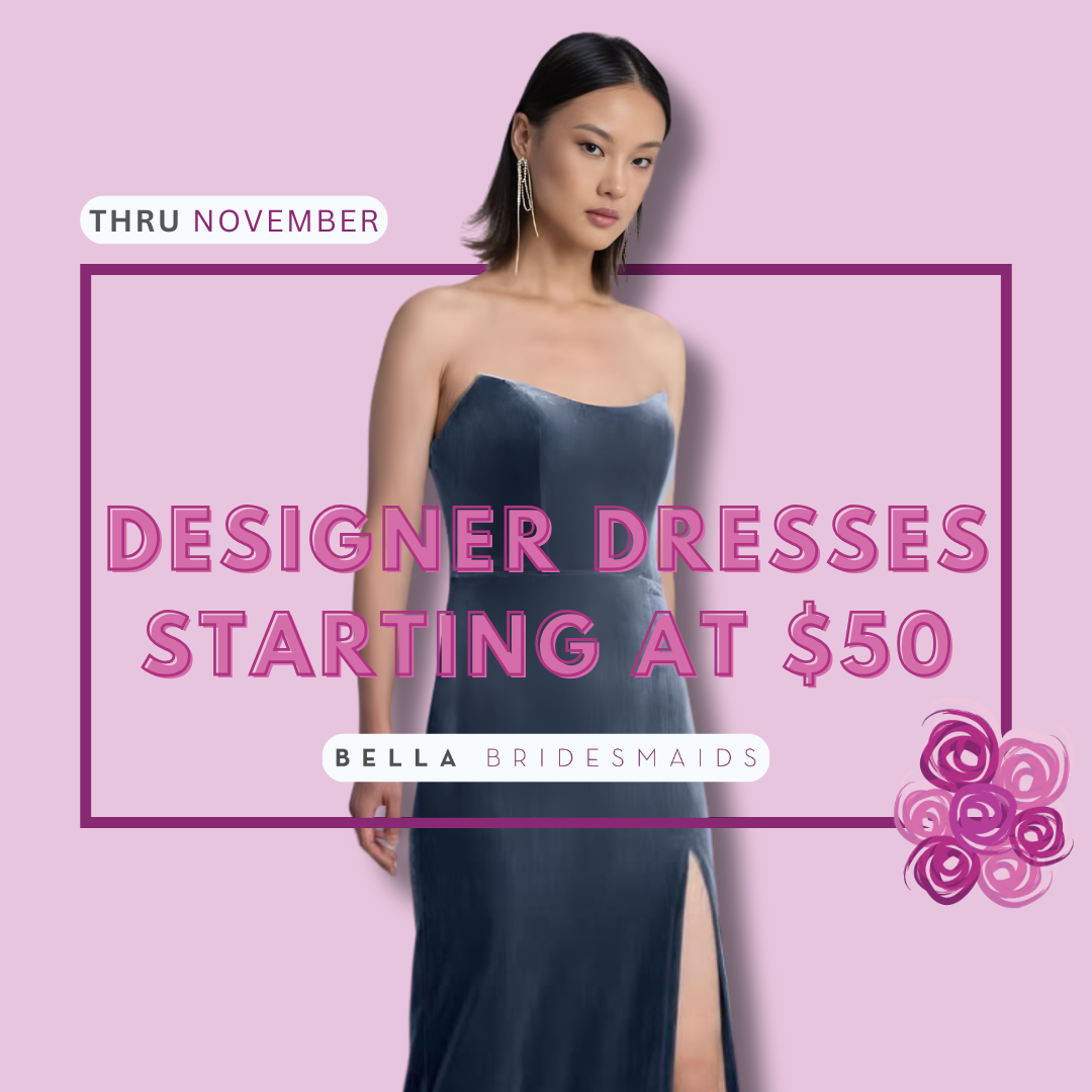 Bella Bridesmaids, find stunning bridesmaid dresses and wedding party accessories. They are offering designer dresses starting at just $50!