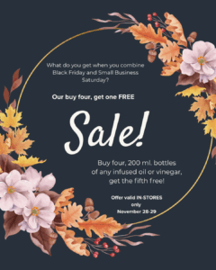 The Tasteful Olive, offering gourmet oils, vinegars, spices, and gift sets perfect for hosts and home chefs. Don’t miss their amazing holiday deals! The Tasteful Olive is running the following holiday specials: In-stores: 11/28-11/29 – Buy 4 infused oils or vinegars, get one FREE (size 200ml only) and Online: 11/28-12/2 – FREE Shipping on orders $40 or more with code thankfulshopping